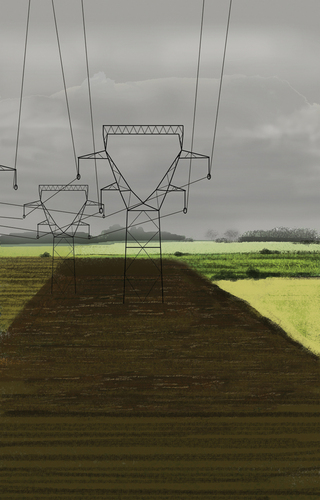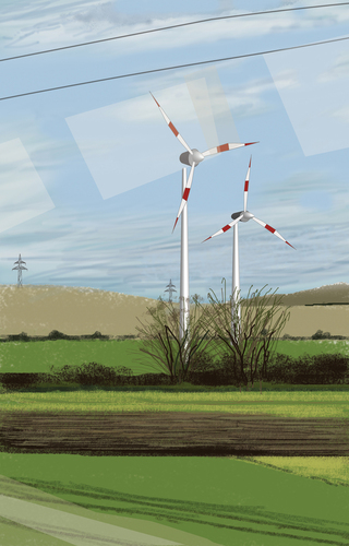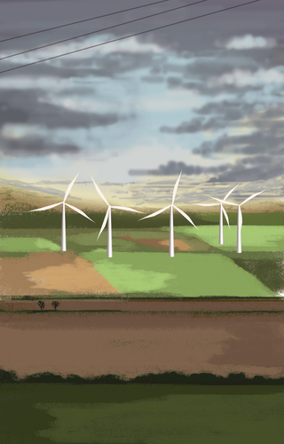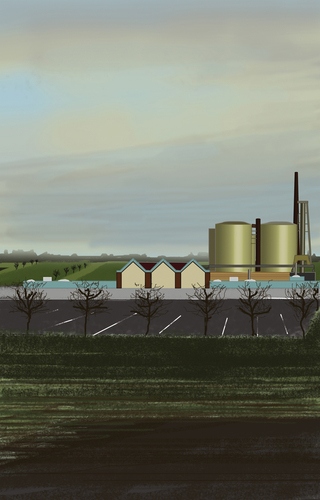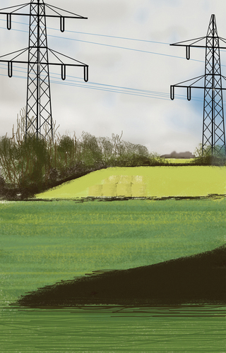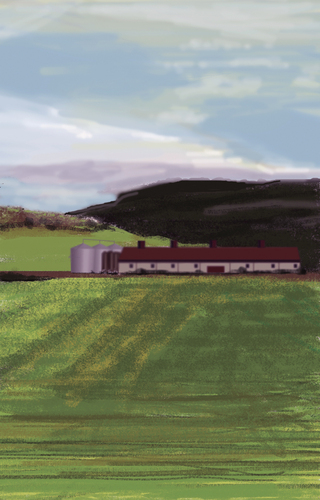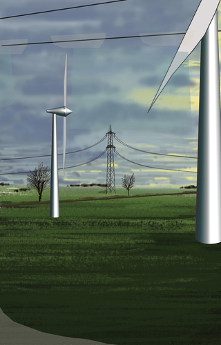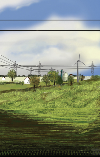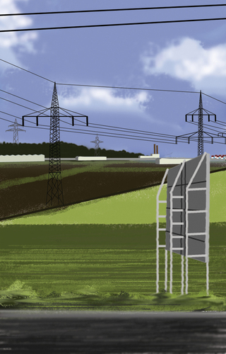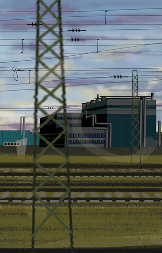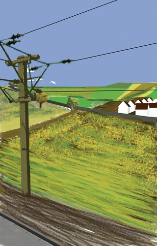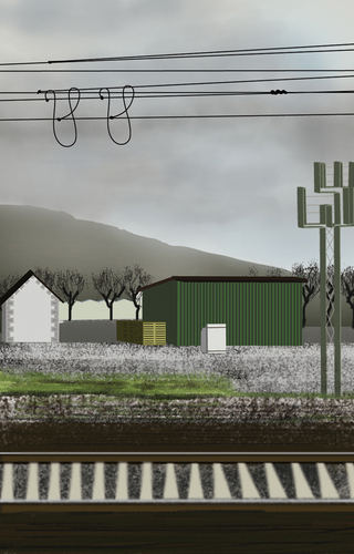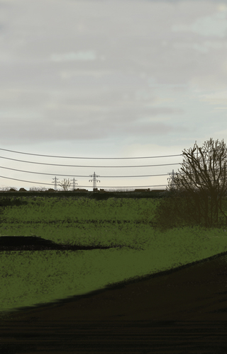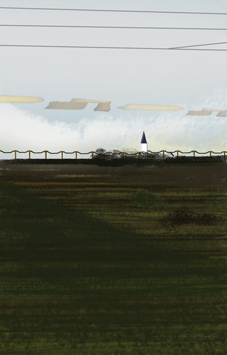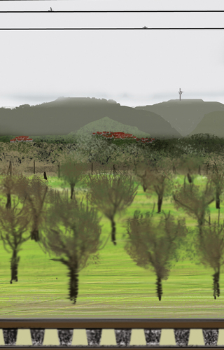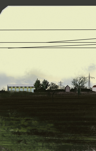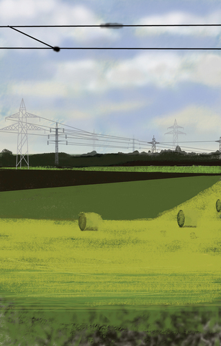 À l’école des Beaux arts de Quimper, c’est en peinture numérique que les premiers tableaux sont réalisés. Guillaume Querré en utilisant des logiciels dédiés au graphisme va dès 2007 réalise une série ‘‘24 paysages vus du train’’. Ces 24 paysages sont une pure fiction, mais ils s’inspirent tous du réel. Lors d’un déplacement entre Quimper et Berlin. L’artiste fait le constat de l’omniprésence d’éléments architecturaux dans la ‘‘nature’’. Il recence, éoliennes, pylônes électriques, friches industrielles et il constitue ainsi un carnet numérique d’éléments récurrents qu’il répertorie lors de ce voyage. De l’aurore au crépuscule, l’artiste s’invente ainsi, au travers de paysages fictifs, une journée passée dans le train.